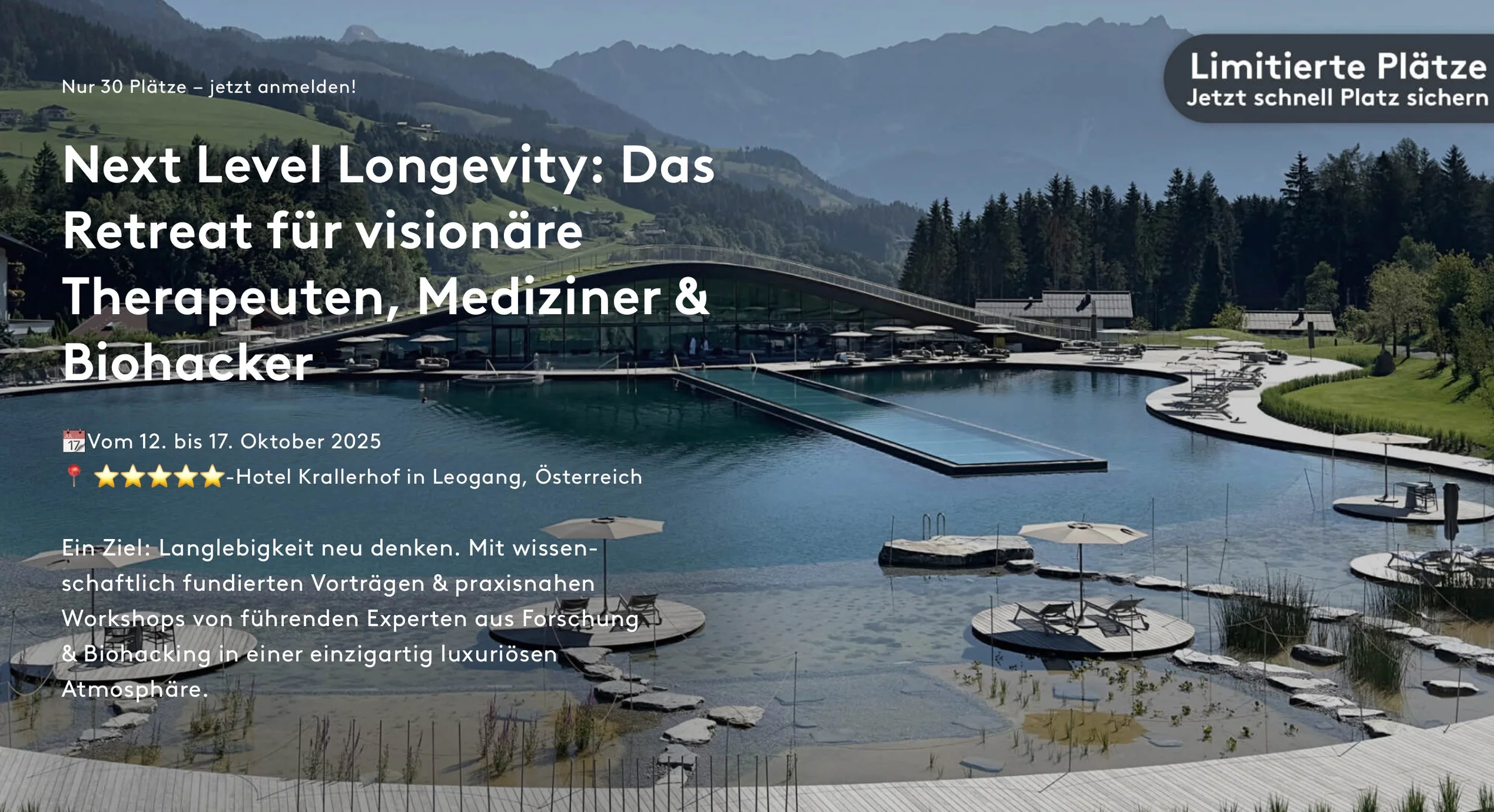 Das Longevity Retreat im Krallerhof ist eine einzigartige Gelegenheit, tiefer in die Welt von Gesundheit, Regeneration und ganzheitlichem Wohlbefinden einzutauchen. Inmitten der österreichischen Alpen erwartet dich ein sechstägiges Programm voller wertvoller Impulse aus Wissenschaft, Praxis und ganzheitlicher Lebensführung.